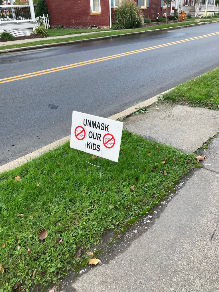 A couple times the top of a hill coincided with houses that had lawn signs worth taking pictures of. Many, many lawn signs supporting the police (no Black Lives Matter in these parts). I took a picture of one that was next to a sign supporting health care workers and wondered if these Trump supporters (they had a huge Trump/Pence sign still out at the side of their house) were vaccinated. While I was still hanging out at the end of this driveway, the door opened and a woman asked what I was doing and why was I taking pictures of her house? I told her I was waiting for my husband and just took a picture of her signs. Another woman also came out walking toward me and said, “Shouldn’t he be waiting for you?” I said, “He has lung disease.” She started coming up to me and I asked if she was vaccinated and she veered away.