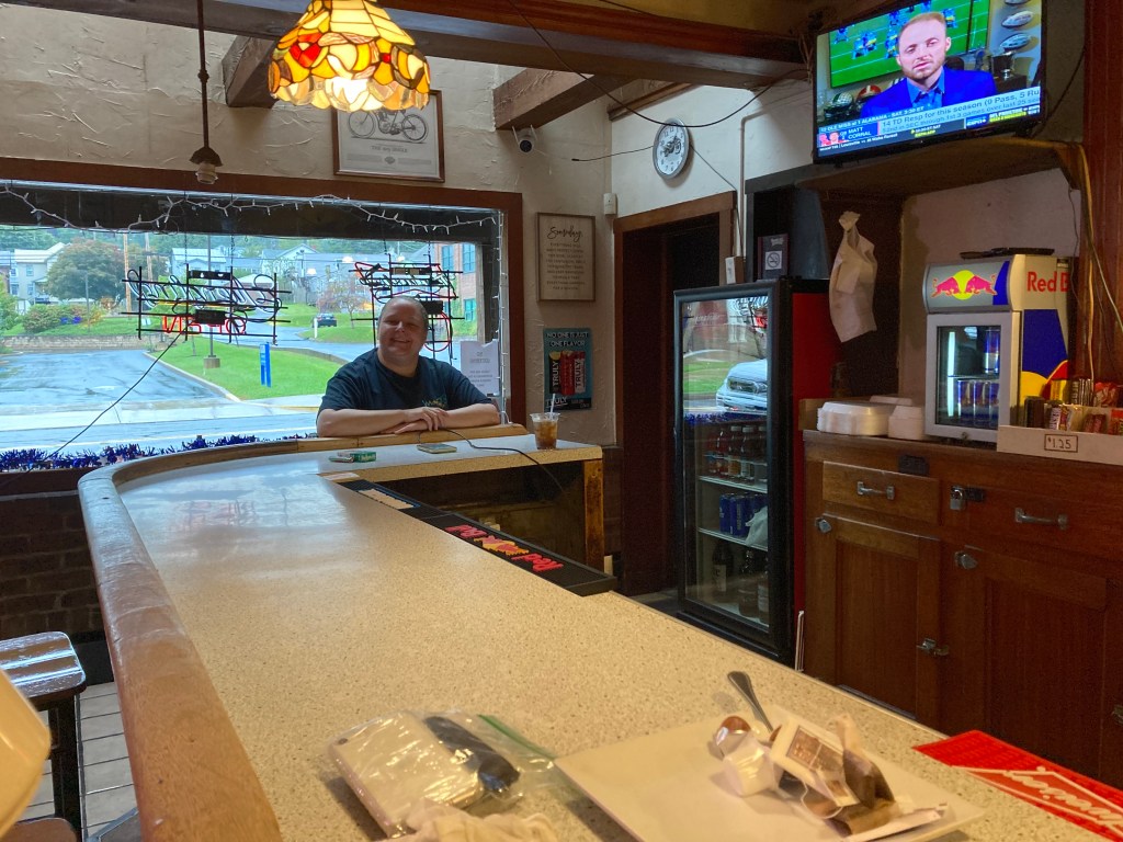 There were two diners and a tavern in town. The diners were both closed. One had a sign that said, “Gone to the fair.” The tavern was open. I’m not a huge fan of bars because they are usually dark. This one was no exception. We sat at the bar because that was the only place we could sit and keep an eye on our bikes parked outside. We were the only ones and the bartender/server was very kind, heating up a kettle of hot water when we asked for hot tea. I said, “You’re the only place open in town,” and she said, “Everyone’s at the fair in Bloomsburg. It’s the biggest one in the state.” I said, “Aren’t you going?” And she said, “No, too many people. I’m going to San Diego next week to visit my daughter and I don’t want to ruin it by getting Covid.” I asked if she was vaccinated and she said, of course. I told her we both were. So then we knew a lot about each other out here in the middle of Trump country.