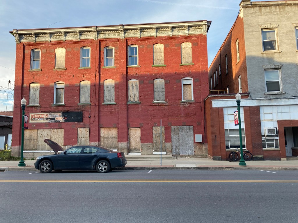 We had ten miles of rolling hills through beautiful farmland, then ten more miles with three or four grueling hills to Brookville where we stopped to have a beer and pizza and take a walk through the historic downtown. Some of the old buildings were obviously lovingly restored, some not so much, and on an adjacent street we could see majestic old Victorian homes. Next to the courthouse was a giant chess set, tables, and a fountain. The small city felt more alive than the last two we’d been through.