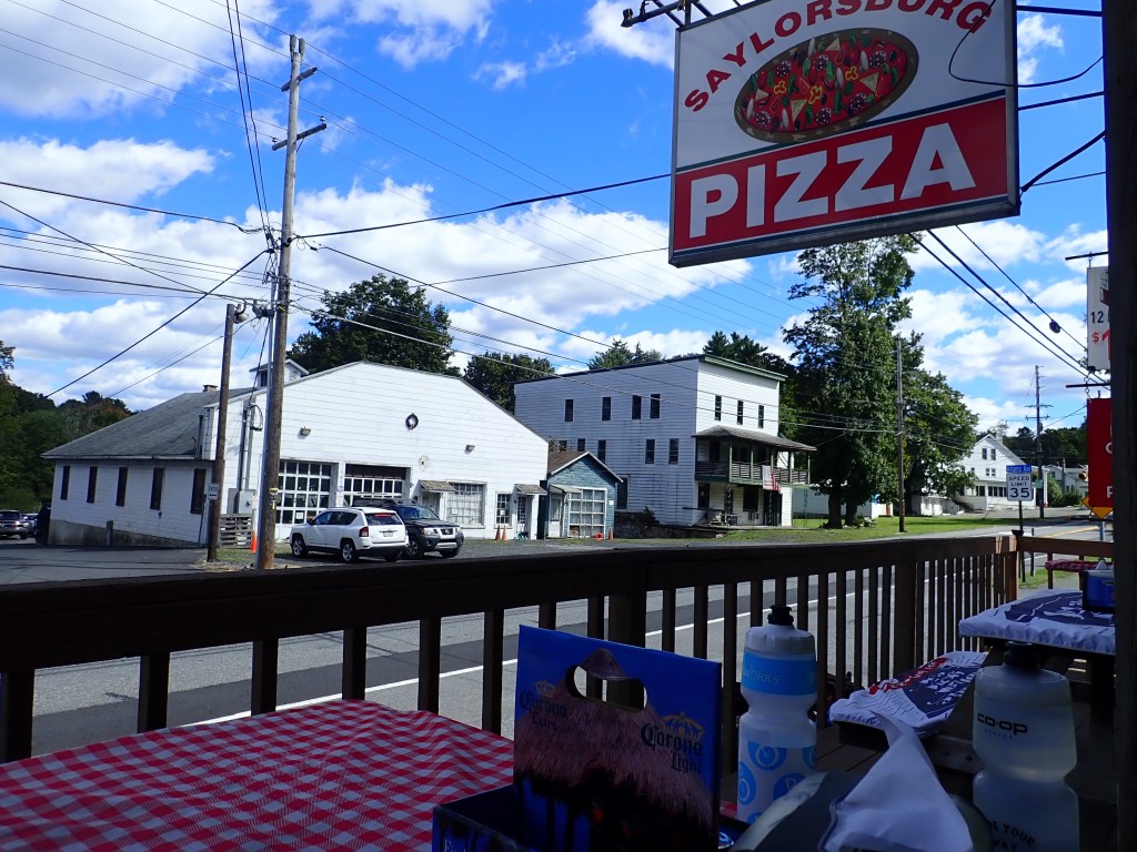 By the time we arrived in Saylorsburg after about 25 miles I was desperate for lunch and a bathroom. Only a few businesses sat along a busy highway with nowhere to sit and have a relaxing lunch and no public bathroom in sight. So we had a couple slices of pizza and soda on the porch of the local pizza joint as semis and loud motorcycles zoomed by.