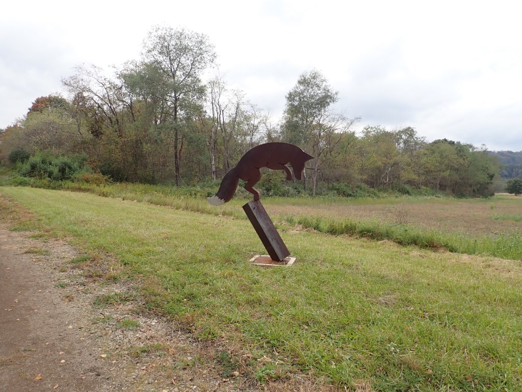 We started on the Redbank Valley Trail in Brookville and followed it for twenty easy miles to the Brick House Bed & Breakfast where we had a room reserved for $105. That was a bargain. We were the only guests and had the whole place to ourselves. The building has three floors with a nook on top, where I am sitting as I write this. It’s surrounded by hills and forests on an expansive piece of land and includes a treehouse and mine shaft replica (that you can sleep in). If this were located in New England we’d be frequent guests.