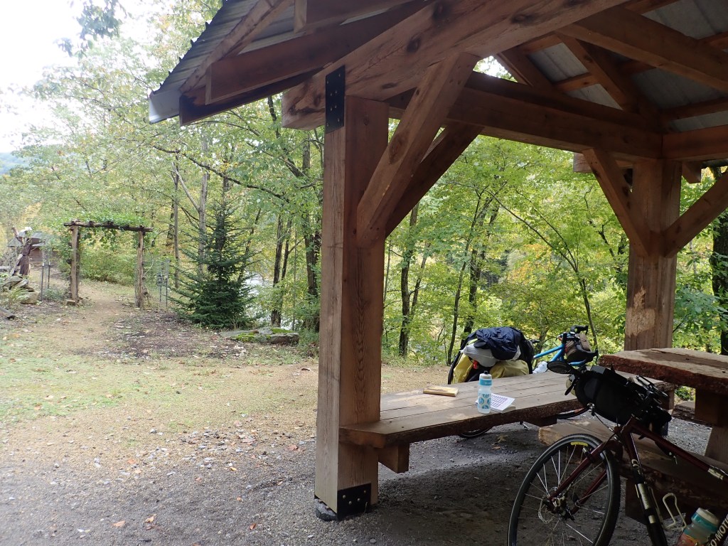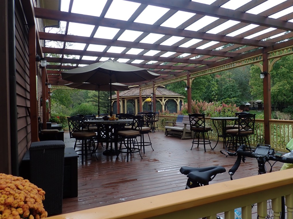 Our change in plans yesterday basically forced us to ride a longer day today. Either that or we’d have had to stop at a state park campground after just 20 miles. It was a beautiful spot and I was tempted, but Rob gave a definitive no. We did have two lovely stops today, one in the morning at a state park picnic area after 16 miles and another this afternoon with 12 miles to go. We stopped at the Hublersburg Inn where we were able to sit outside on their lovely patio and had butternut squash soup and sweet potato fries. Rob wanted to order an IPA but I convinced him that it might not be a great idea with 12 miles to go and I wouldn’t share a beer unless it wasn’t an IPA.