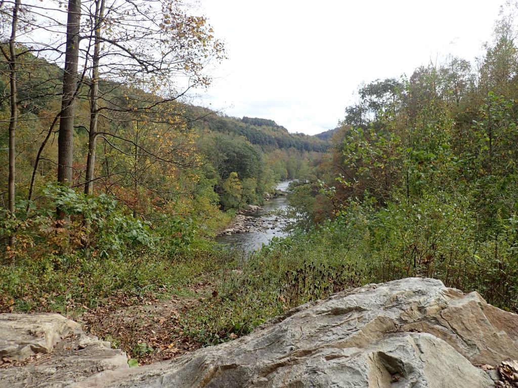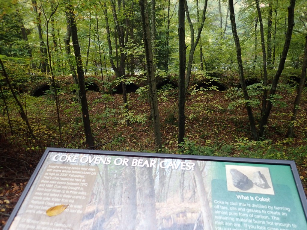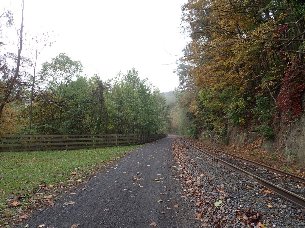 We had a nice switch today from all the hills and traffic, and the scenery was lovely. We rode next to a river all day, first the Red Bank, then the Allegheny. Fallen red and orange leaves sprinkled the path. We were surrounded by varying shades of green and yellow foliage, lots of wild rhododendron and evergreen mixed with deciduous trees. It was another day of dramatic clouds coupled with an occasional downpour. We had plenty of opportunities to take a break from riding with many benches and even covered picnic tables along the way. All day we only saw a couple other people on the trail. And lots of coal history.