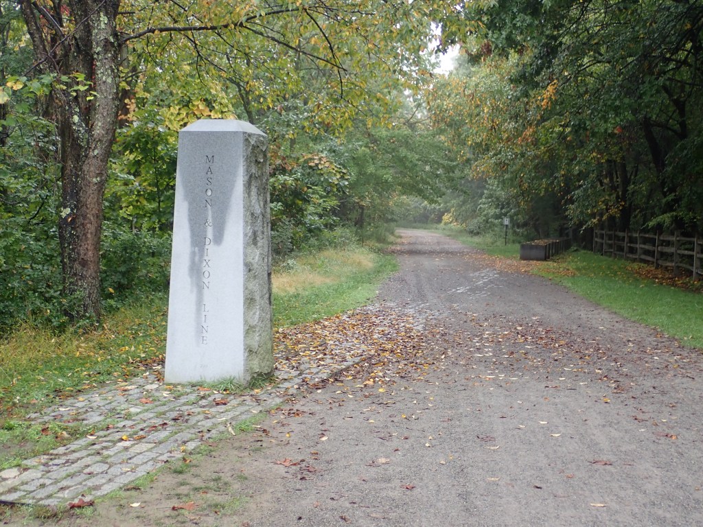 Then we stopped at the Mason Dixon Line where some monuments marked our entry to Maryland. We all know the Mason Dixon Line as the official demarcation of the northern vs. southern states during the Civil War. It was commissioned by two English Colonial families to settle a land dispute and only a decade or so later they lost their land to the American Revolution. Too bad for them. Rob recently brought my attention to a song by Mark Knopfler called “Sailing to Philadelphia” about Mason and Dixon. It’s a great song, one I’d heard countless times (because Rob plays it in the car countless times) but I’d never really given it much thought.
