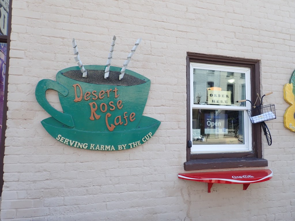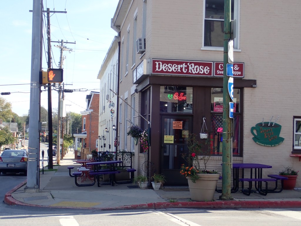 We were on the trail by 8:25 this morning, but the bumpety-bump roots and rocks and divets slowed us down so it took us almost two hours to ride the 16 miles to Williamsport and the Desert Rose Cafe. It was refreshing to find a business that takes Covid seriously, having folks place their orders via an outside window and the staff wearing face masks. But we were able to sit inside to enjoy our backon, cheese, and egg sandwiches on a croissant. As we lingered and caught up on email, Rob realized he had a message that a room was available for us in Shepherdstown, 27 miles down the road. We grabbed it, and enjoyed a more leisurely afternoon ride knowing we had a place to stay, looking forward to showers and a comfortable bed.