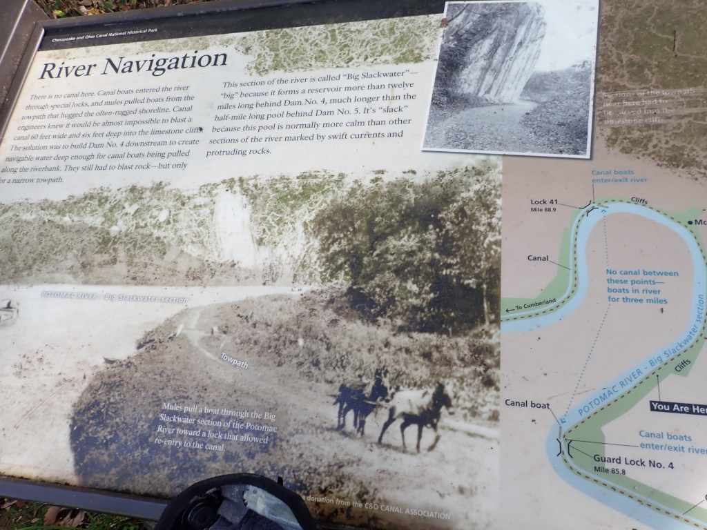 While Rob and I are both very tired of the rough riding we’ve had for so many days, today did provide some interesting terrain. We were again routed off the towpath for a detour but this time onto rolling hils and paved roads through some open farm countryside, a nice change from the constant tree canopy of the canal path. Then immediately after we rode on a cement path hugging rock cliffs as the canal was designed to make use of a calm section of the Potomac River when the engineers realized they would never be able to blast through the rock. So they built a dam instead to control the water level of the river.