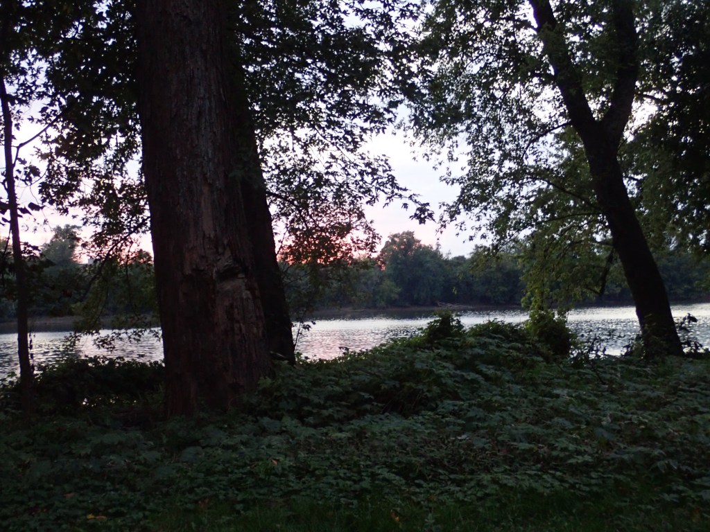 Even though the planes stopped flying overhead around 10 o’clock last night, it was still not a quiet night. Around midnight someone started shooting fireworks across the river and they went off intermittently for about an hour. I wasn’t sleeping because I was immersed in a good book, but they were worrisome as fireworks have been known to start fires and there we were camped in the midst of trees.