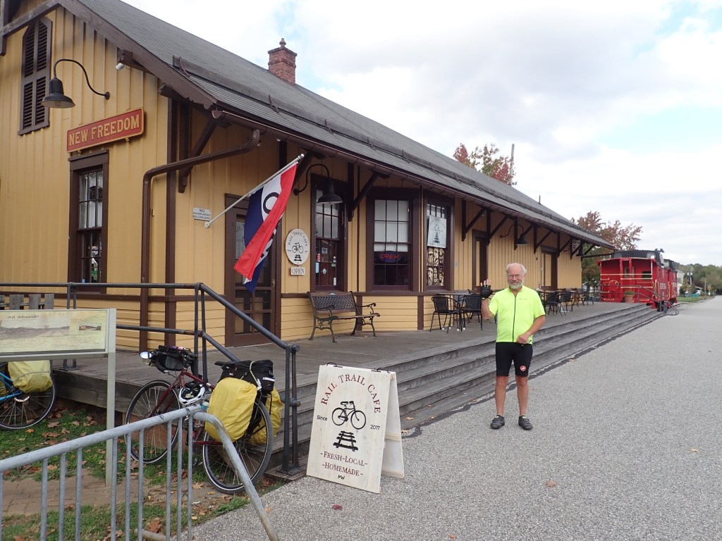 At the Pennsylvania border the trail became the York County Heritage Trail. This section was smoother than the previous one and shortly after it started we began a long descent that took us to our Warm Showers hosts in York. Along the way we passed the Rail Trail Cafe in New Freedom where I insisted we stop for a cup of tea, if only because we’ve found so few cafes on this trip I wanted to stop and savor this one.