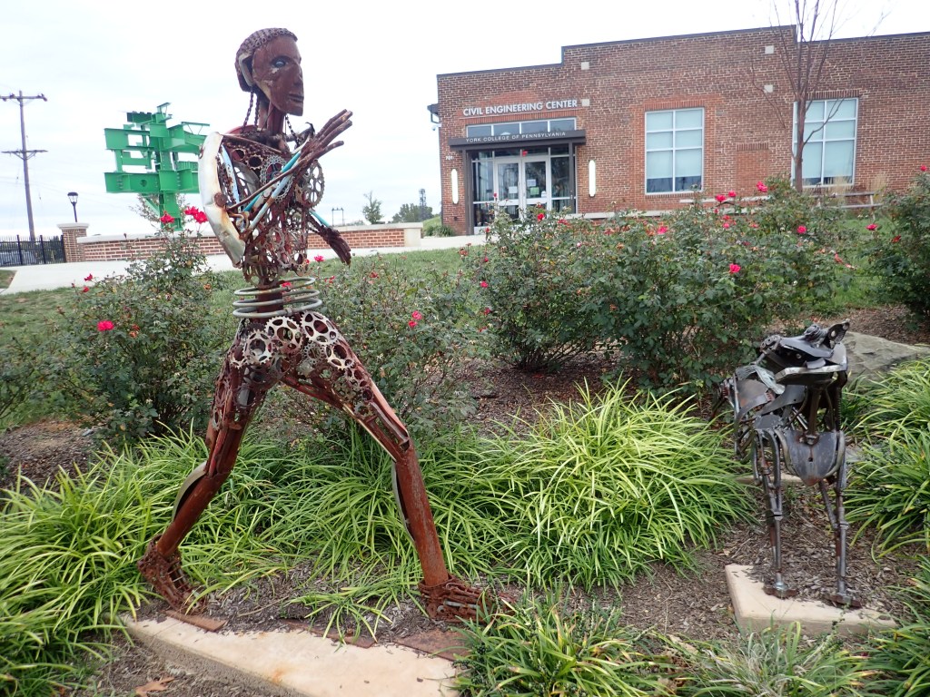 We arrived in Lancaster in time for lunch but first left our bikes at the Holiday Inn where we are spending the night, right in the historic downtown. We set out to find lunch and got distracted by several art galleries. It turns out that Lancaster is home to a thriving art community. We enjoyed a delicious lunch at the Prince St. Cafe (I had a falafel bowl with rice and vegies and Rob had a chicken and rice bowl with avacodo and other stuff) then visited two more art galleries. Every one of the galleries we visited had an impressive variety of artwork. We also stopped in at the small Lancaster Art Museum where they had a juried exhibition of “functional pottery.” I was not impressed. But what do I know? Many of the pieces, from artists all around the country, had already been sold. I still think that much of the pottery I see in craft shops is a lot nicer.
