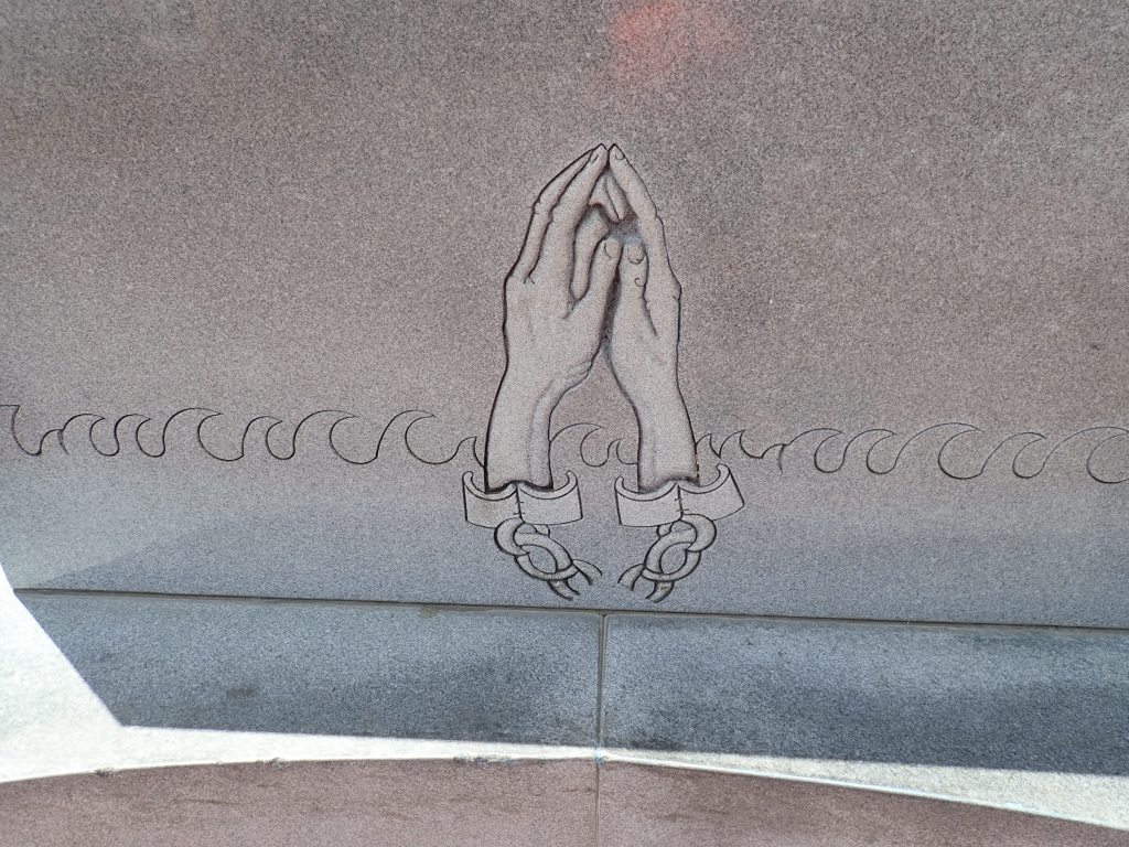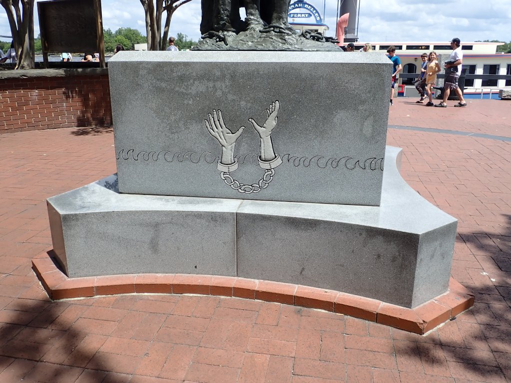 A quote by Maya Angelou is carved into one side of the base: “We were stolen, sold, and brought together from the African continent. We got on the slave ships together. We lay back to belly in the holds of the slave ships in each others excrement and urine together. Sometimes died together. And our lifeless bodies thrown overboard together. Today we are standing up together with faith and even some joy.”