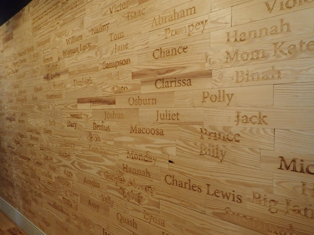 In 1830 the house was purchased by George Owens who moved in with his wife, six children, and nine enslaved servants. He also owned about 600 slaves who worked on his plantation. The wall below, in the former slave quarters, honors those people, with a block for each whose name was known, and blanks for those whose names have been forgotten.