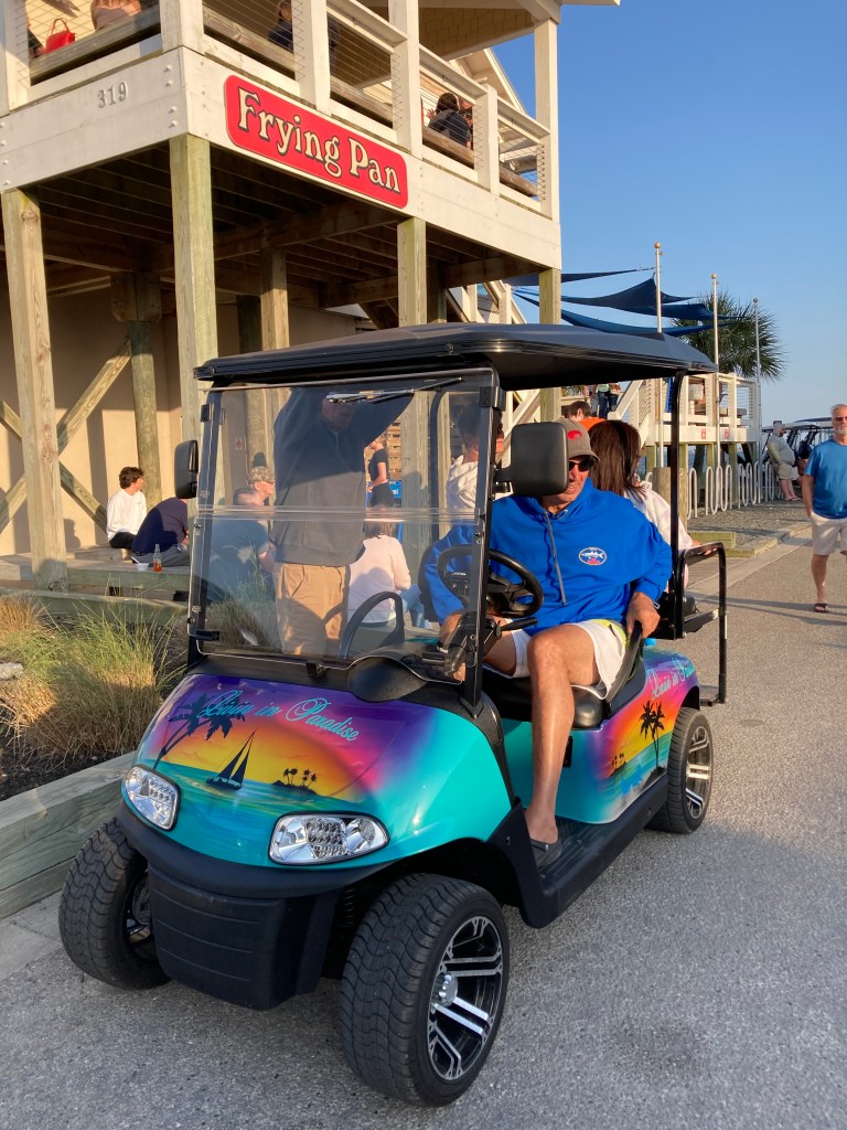 Above is one of the many beautiful homes in the historic district of Southport, NC. On the left is a unique, fun golf cart outside the restaurant where we had dinner. Golf carts abound in the south. Only a few are personalized.