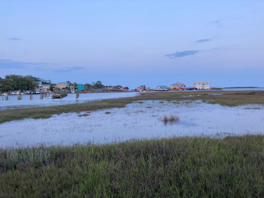 After cleaning up we walked to the waterfront to get some dinner. All the restaurants were crowded with lines of people waiting. Our dinner at The Frying Pan was pleasant enough. I ordered shrimp and grits because I’ve determined that, just like lasagne, everyone makes it differently. But, although I enjoyed the shrimp and grits that my cousin’s husband cooked, I’ve decided that I’m done with trying grits.