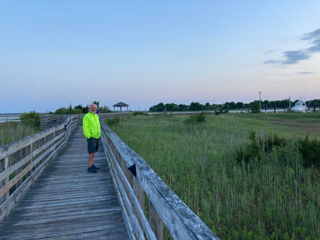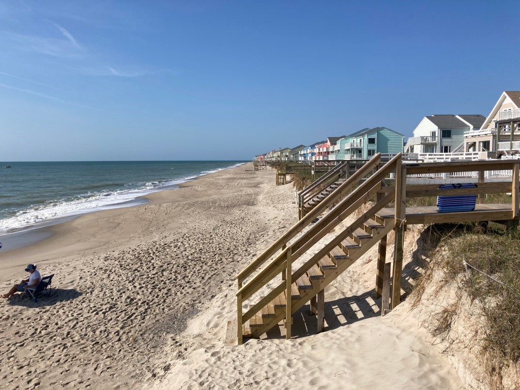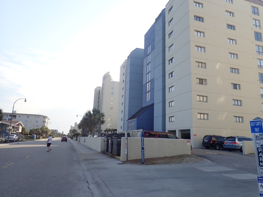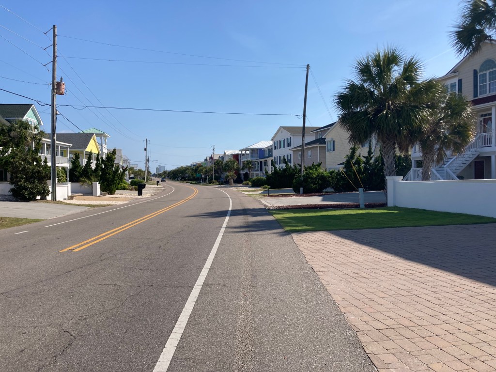 We rode out of Wilmington then on back roads to Surf City and North Topsail Beach. Although we were riding with the ocean on one side and marshes on the other, we didn’t really get many views of the water, as the streets were lined with houses. But the houses were lovely, mostly new and painted in myriad pastel colors.