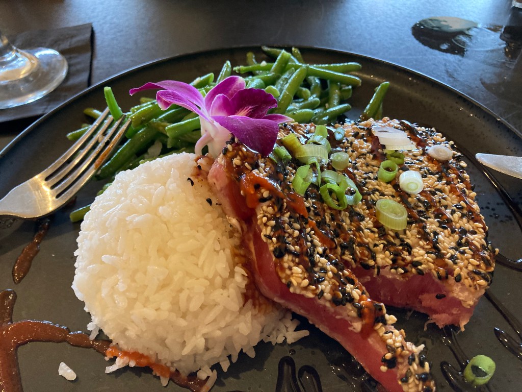 With the headwind and no-fun ferry rides it was a treat to have a delicious dinner. I had seared tuna and sticky rice.