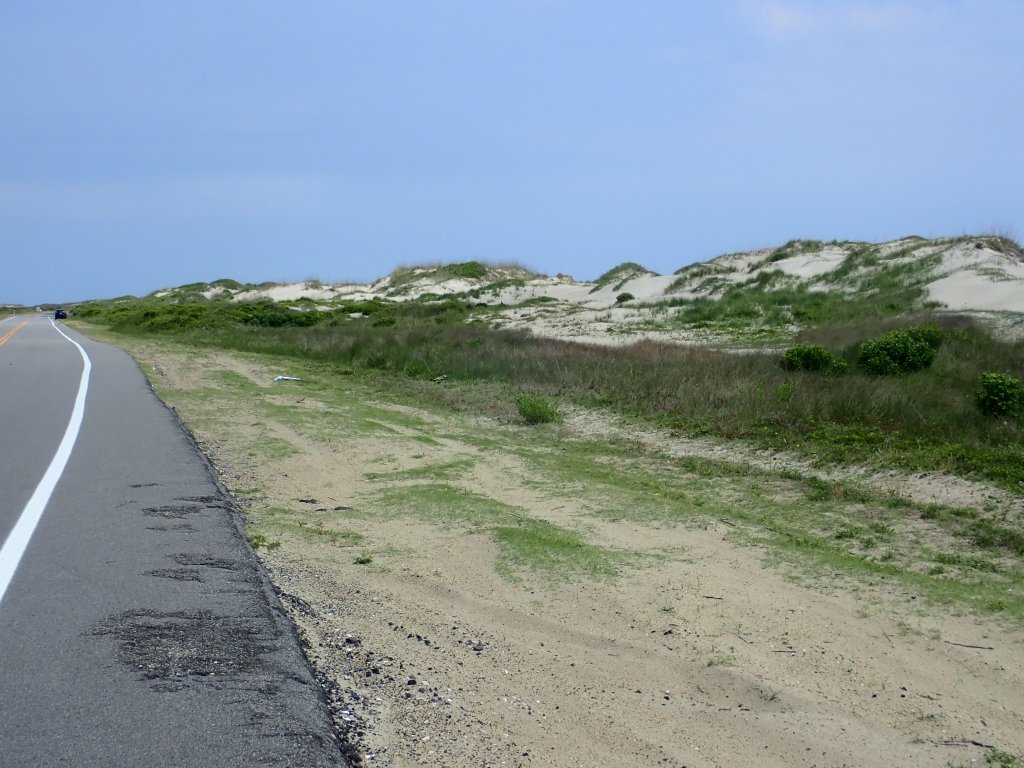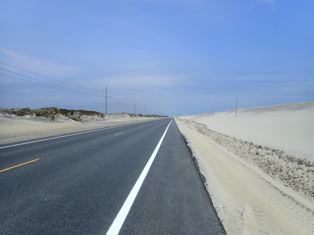 Sometimes sand covered the shoulder. At onepoint we passed a bulldozer clearing sand off the road.