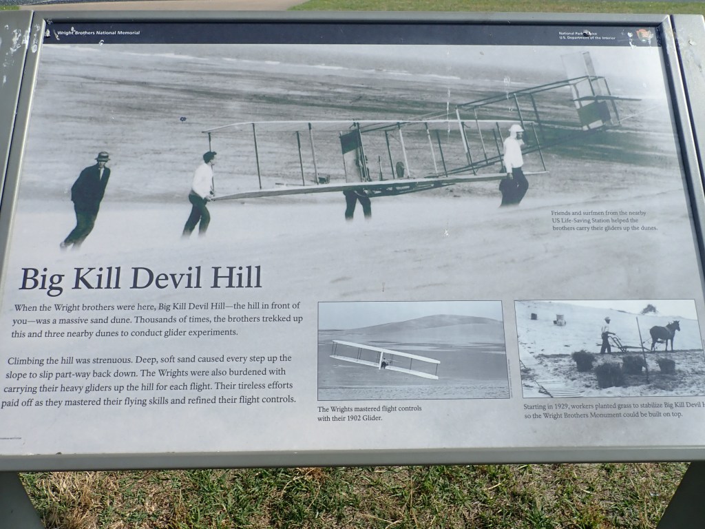 All the grass you see in the3se photos was sand when the Wright brothers were testing their gliders. They had to carry the glider up a sand dune for every test flight. And you think carying beach chairs and an umbrella on flat sand is hard work.