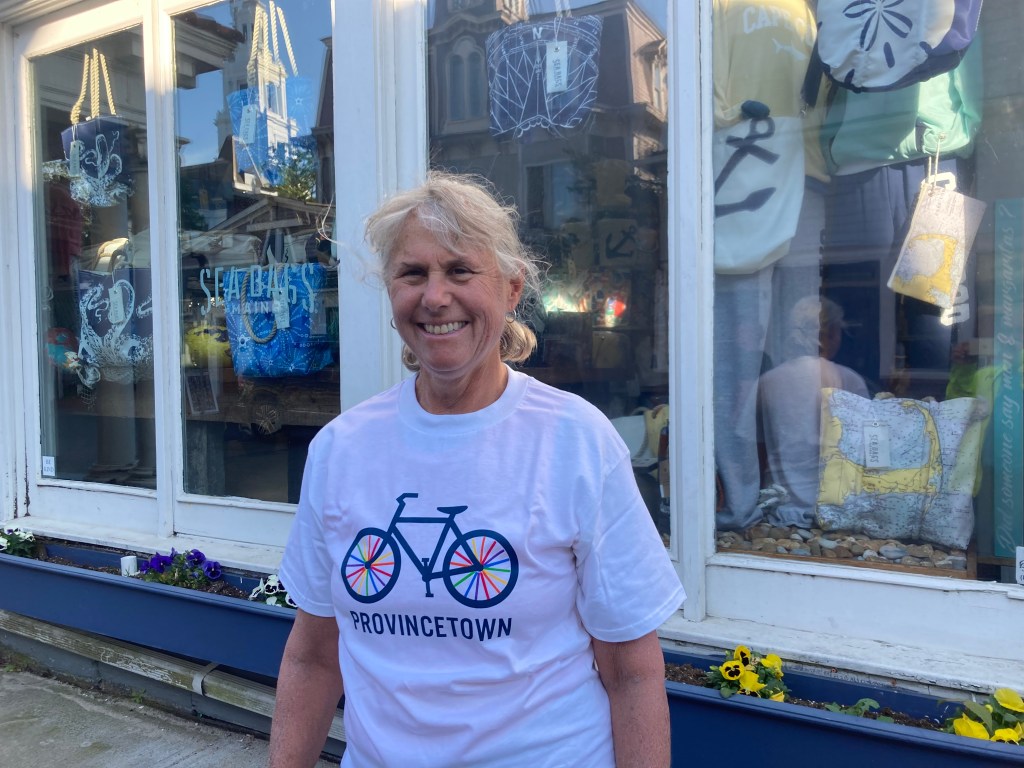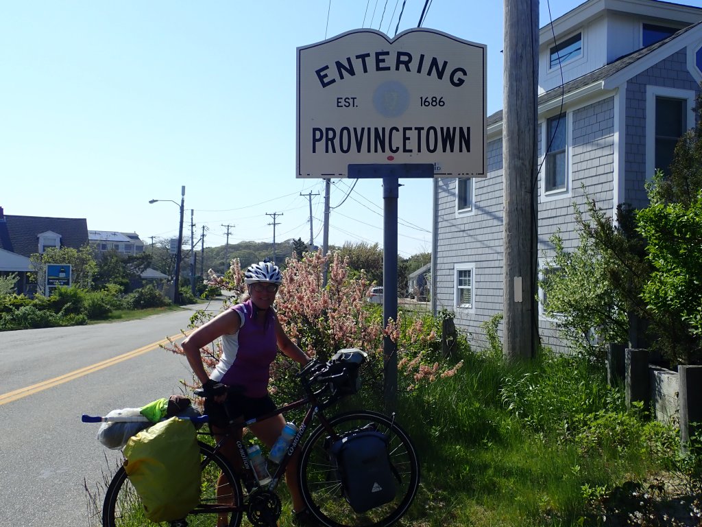 In Wellfleet we stopped at the PB Boulangerie for a shared lunch of quiche, salad, and raspberry tart, which powered us for the last 20 hot miles. Don’t let anyone try to convince you that the Cape is flat. The first few miles after lunch we rode along the coast then inland on windy, hilly backroads. Then we were on Route 6 for about 10 miles. It had a decent shoulder, but it was hot and we’d average about one climb every mile. Then the last 5 miles into Provincetown we rode on Route 6A along the western shore of Truro, past picturesque cottages along the shore. Aside from being tired and hot, it was a pleasant way to end a six-week adventure.