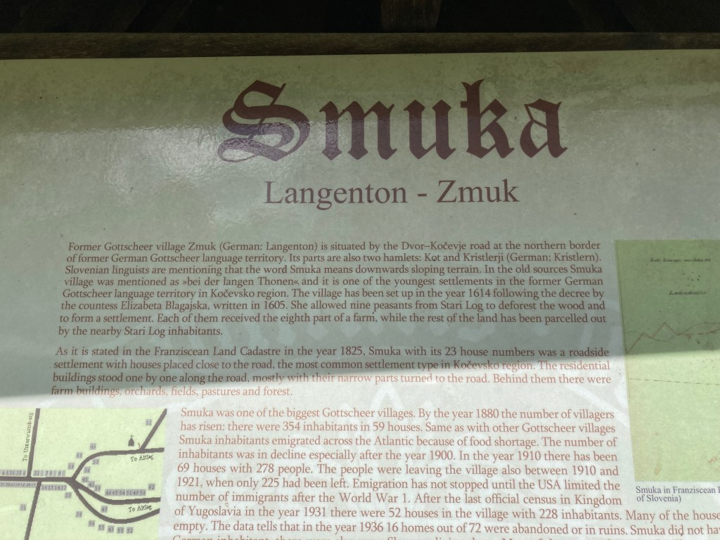 When we visited the site of what was once the village of Langenton, that had my great-grandfather’s inn, a school, a church, and 72 houses, we found the town of Smuka, just a collection of modern homes built up and down a few roads on the hillside on a quiet country through road. On the edge of town we found a sign like the one in Reichenau describing the history in English, German, and Slovenian. I took many photos of the sign. If you’d like to read more about the town’s history, you can find the photos here.