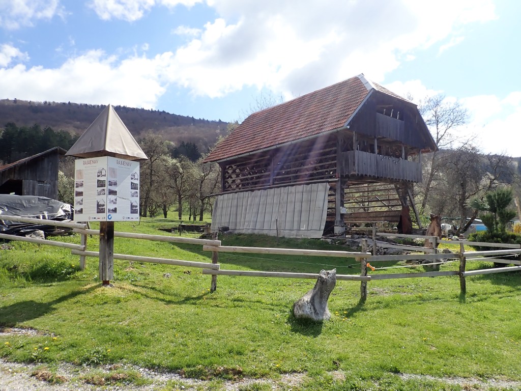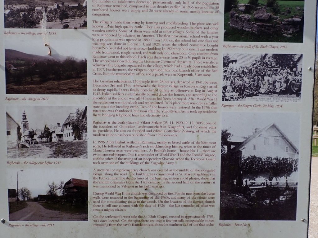 At the end of a dirt road we found the farm, where they raised cattle and donkeys and had rooms for lodging and places to camp. Near where we parked we saw a sign that told the history, in German, Slovenian, and English, of what was once a town.