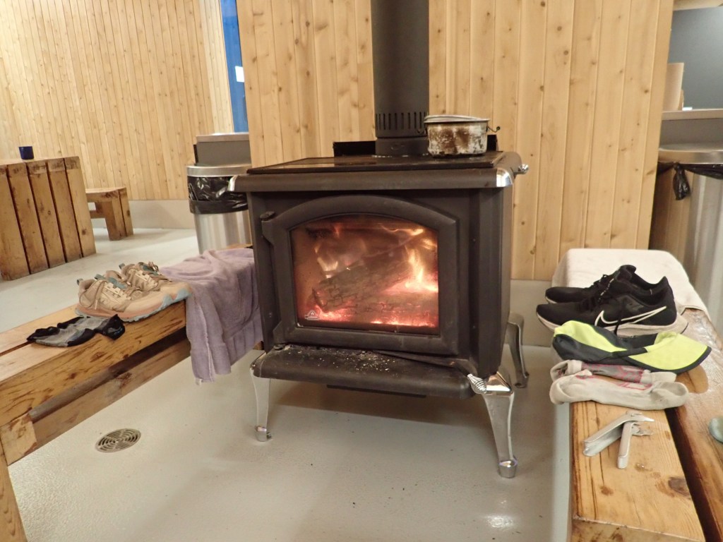 I set to work starting a fire in the wood-burning stove. It became hot enough to heat up our dinner and we were able to dry out some of our wet things. We had pleasant conversations with other folks who wandered in.